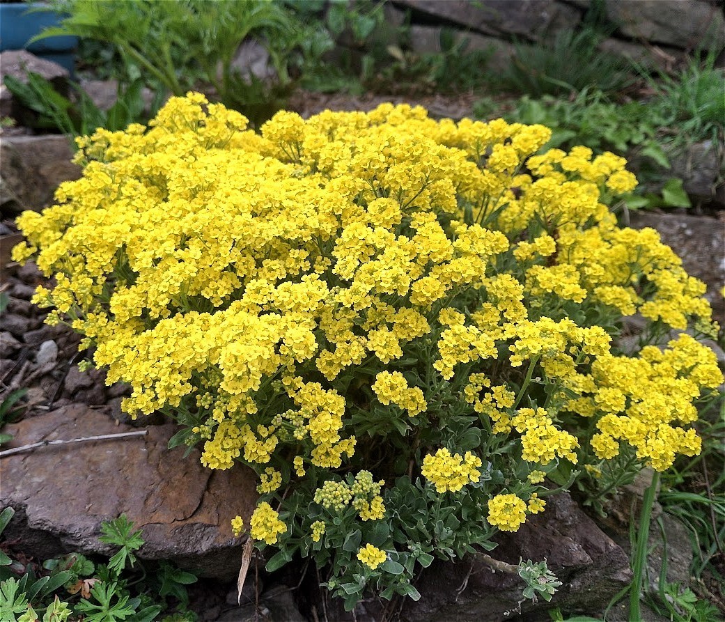 Alyssum saxatile 'Gold Kobold' est une plante vivace rustique formant un couvre sol compact de feuilles vertes grises lancéolées, s'étalant rapidement. Au printemps, la plante se couvre de milliers de petites fleurs jaunes d'or, avec une remontée prononcée à l'automne. très résistant à la sécheresse. Plante mellifère.