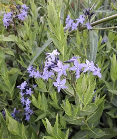 Amsonia 'Blue Ice' est une plante vivace rustique développant des tiges dressées de sa souche racinaire compacte, s'élargissant lentement mais durablement. Les grappes terminales de fleurs s'épanouissent en fin de printemps et en été, et laissent apparaître de magnifiques étoiles bleu métal. Feuillage d'automne jaune.