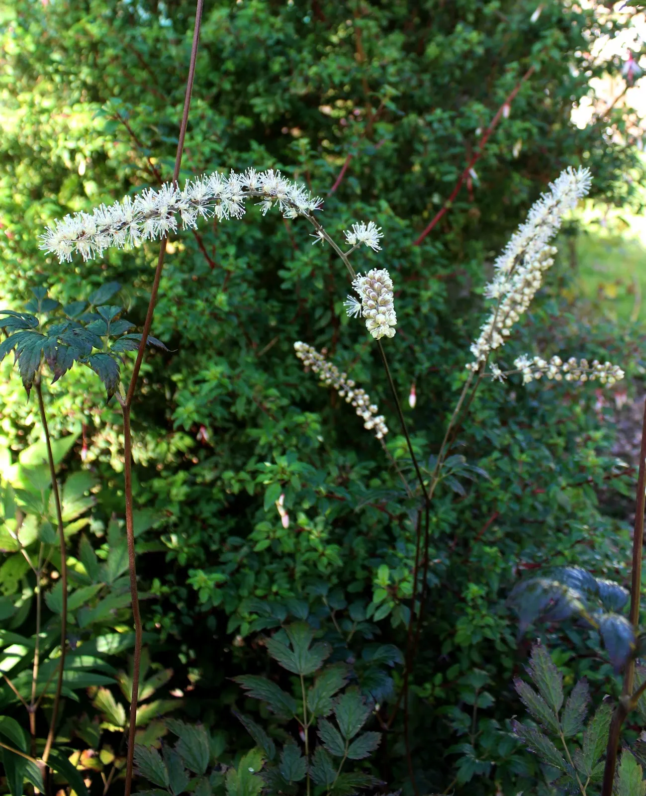 Actaea 'Queen of Sheba' est une plante vivace herbacée rustique se développant de son stock racinaire à chaque printemps, poussant généralement assez lentement mais d'une durée de vie à toute épreuve ! Les grandes feuilles pourpres, presque noires, contraste avec les longs épis blanc pur retombants, qui se développent dès la fin de l'été et encense tout le jardin de leur délicat parfum rappelant la vanille.