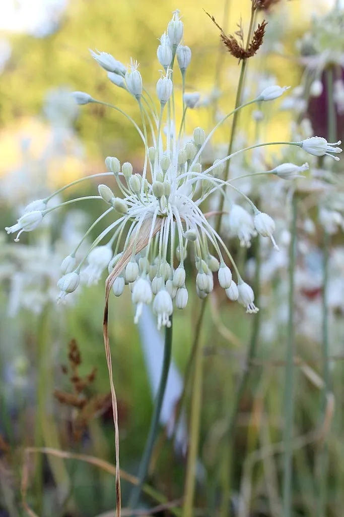 Allium carinatum pulchellum 'album' est un bulbe de la grande famille de l'ail. En début d'été, les tiges florales émergent du sol pour donner une floraison spectaculaire de nombreuses clochettes retombantes. Cette petite plante sans exubérance donnera des touches de hauteur et légèreté à vos rocailles au milieu des sedums et autres vivaces basses.