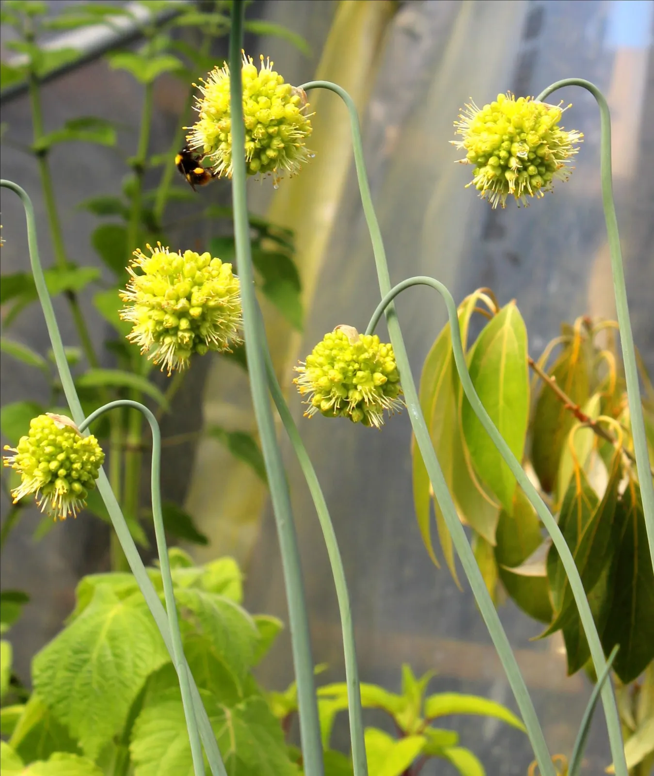 Allium obliquum est un bulbe vivace de la famille de l'ail. En dormance de la fin de l'été à la fin de l'hiver, où les bulbes groupés s'épanouissent laissant apparaître une belle touffe de longues et fines feuilles vertes grises. A partir de juin, les tiges fleuries portent de jolies petites boules de fleurs jaune pâle d'abord obliques puis dressées ensuite.