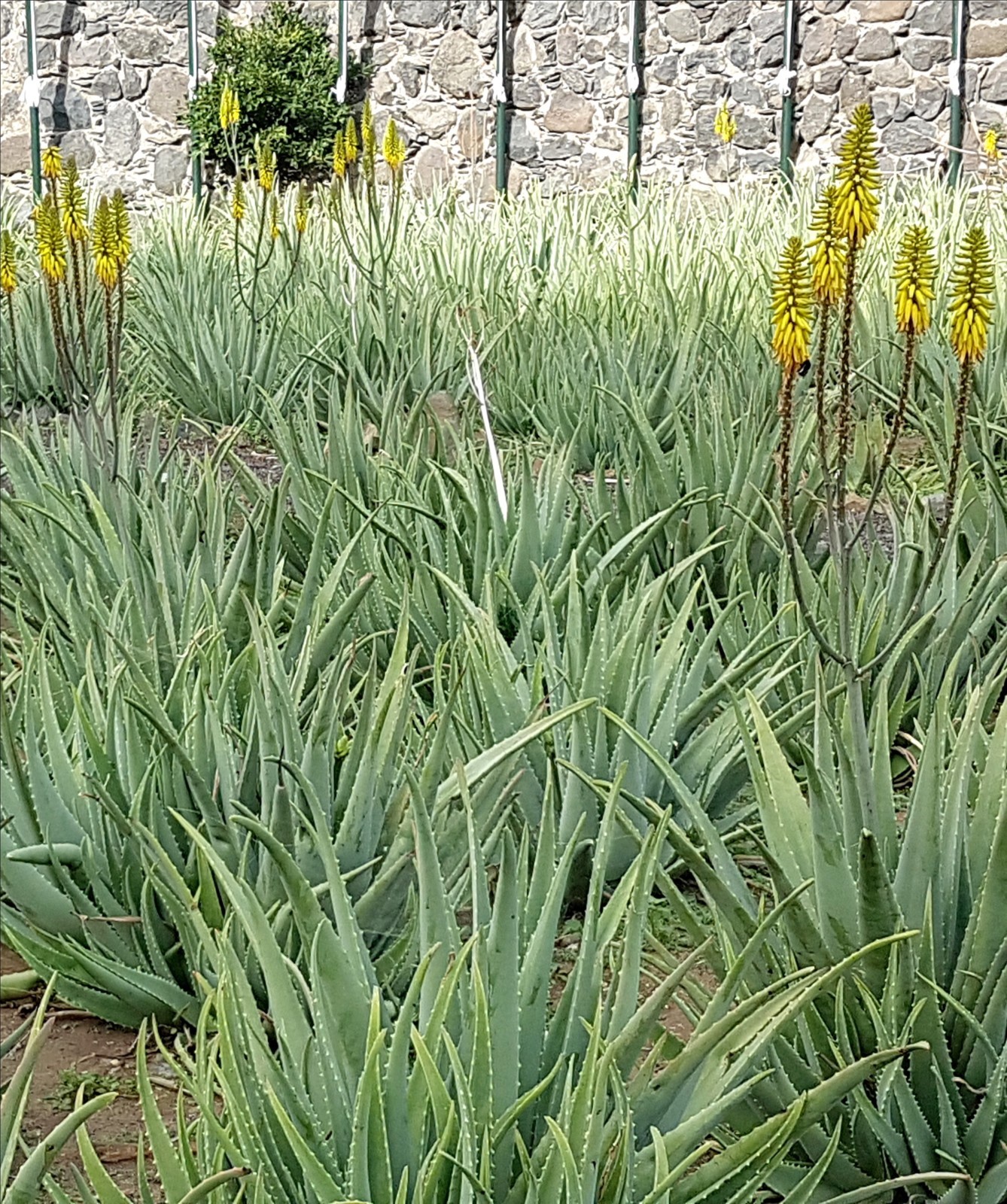Aloe vera, plante succulente par excellence, forme une touffe d'un beau vert clair bleuté de feuilles épaisses gorgées d'eau. Les rosettes de feuilles sont groupées les unes à coté des autres et de nouvelles se forment chaque année. La floraison sur des hampes dressées de belles fleurs jaunes a rarement lieue en France, excepté sur la côte d'Azur.