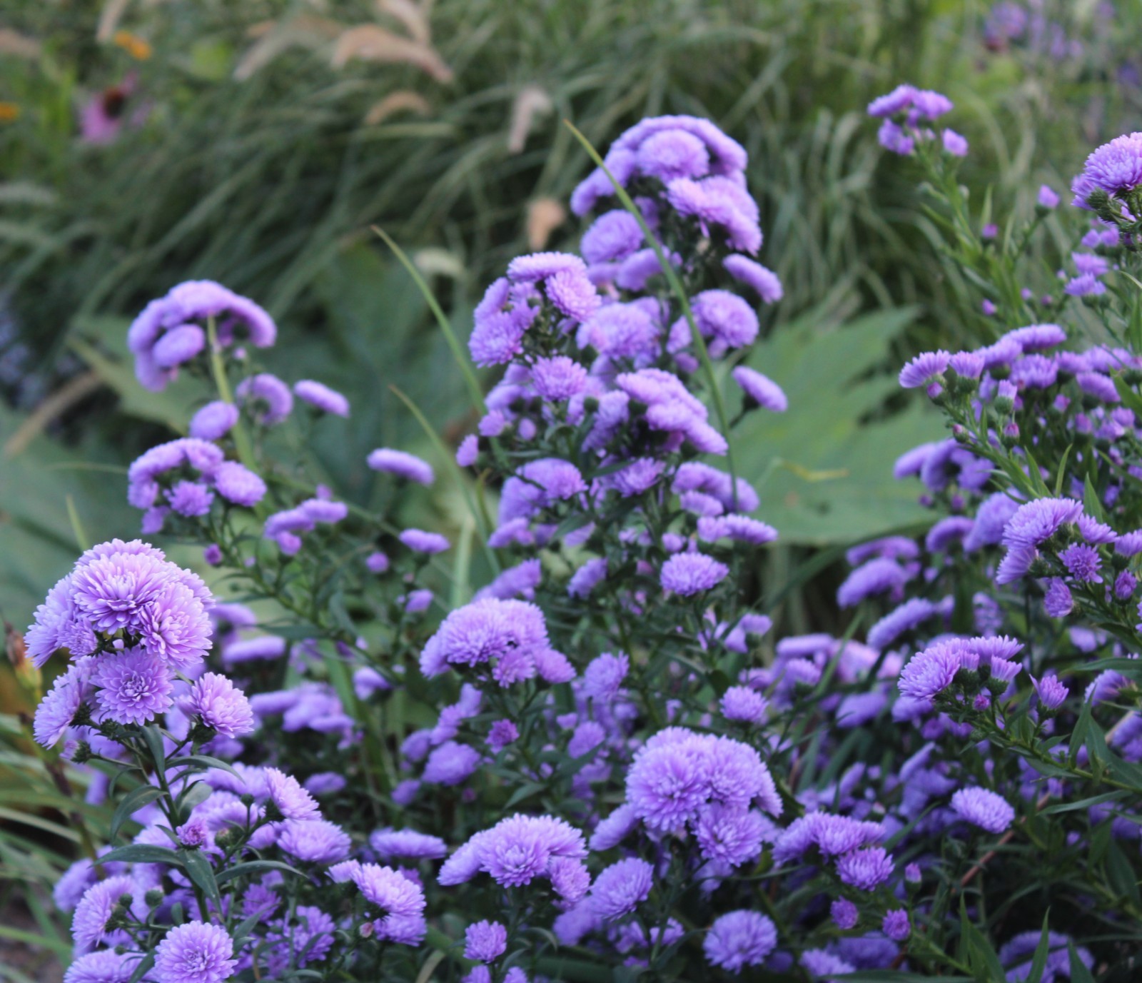 Aster 'Mystery Lady' est une plante vivace très rustique qui forme des touffes denses grâce à ces racines souterraines vigoureuses. En fin d'été, le coussin de feuilles vert foncé, large et étalé se couvre de ponpons violet électrique.