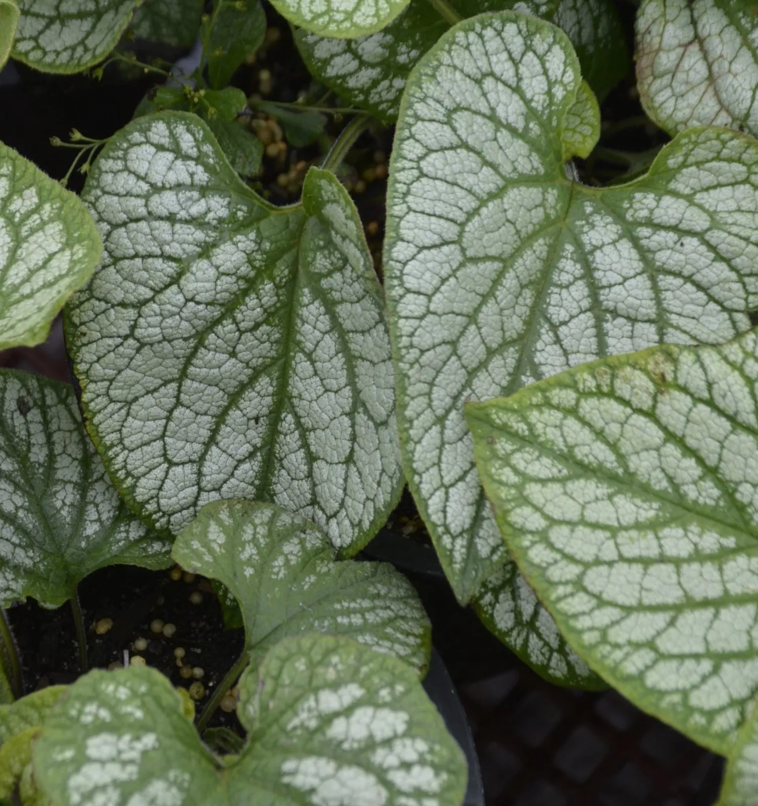 Brunnera macrophylla 'Jack Frost' est une plante vivace caduque formant des touffes de larges feuilles arrondies panachées argentées, se développant tôt au printemps et suivies de grappe de petites fleurs bleu roi, semblable à celle du myosotis. Un couvre sol facile qui s'installera lentement mais surement, à l'ombre et idéalement en sol pas trop sec.