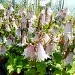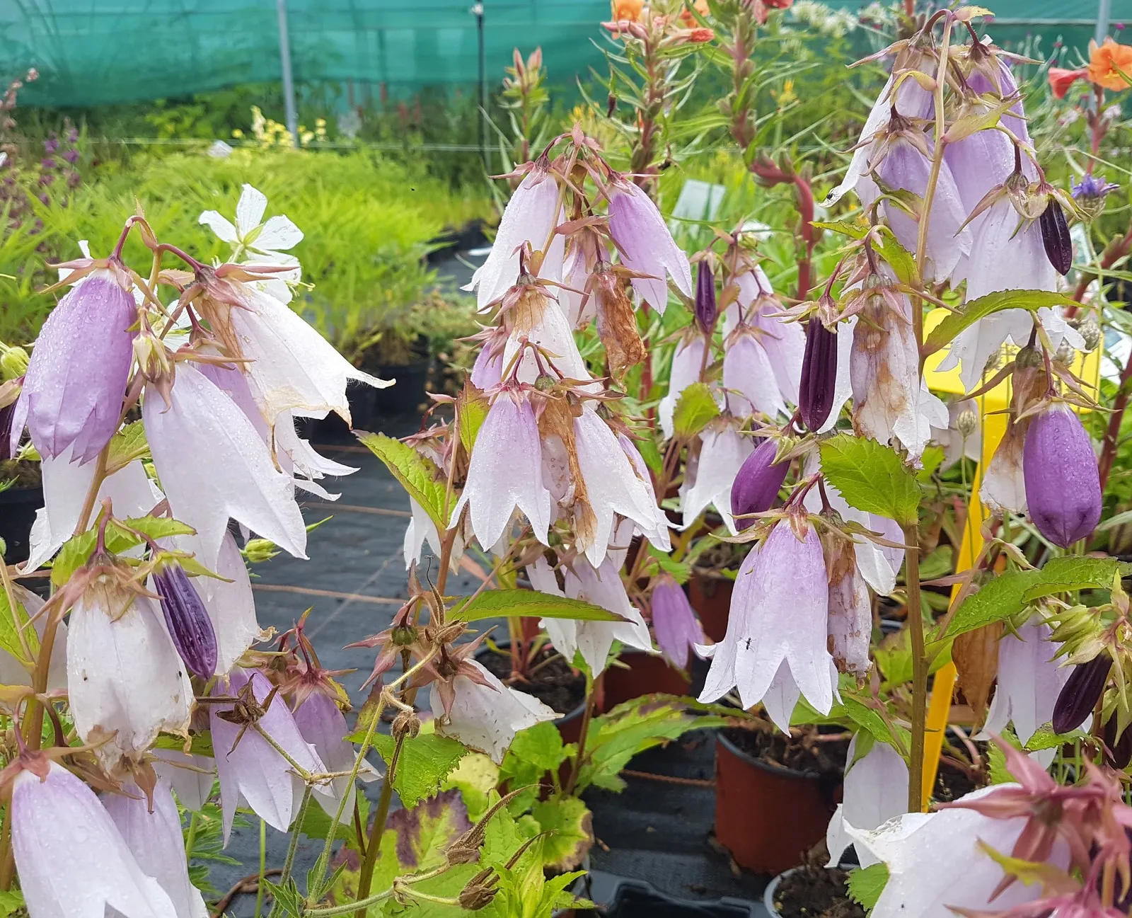 Campanula punctata 'Iridescent Bells' est une vivace herbacée vigoureuse qui forme une touffe à partir de ses racines souterraines, s'installant tranquillement d'année en année en bordure ou au devant d'un massif, d'un beau feuillage vert luxuriant. Longue floraison de l'été à l'automne de dizaines de clochettes mauves pales, légèrement argentées aux extrémités, mais d'abord violet foncé offrant une palette de couleurs tout au long de la floraison.