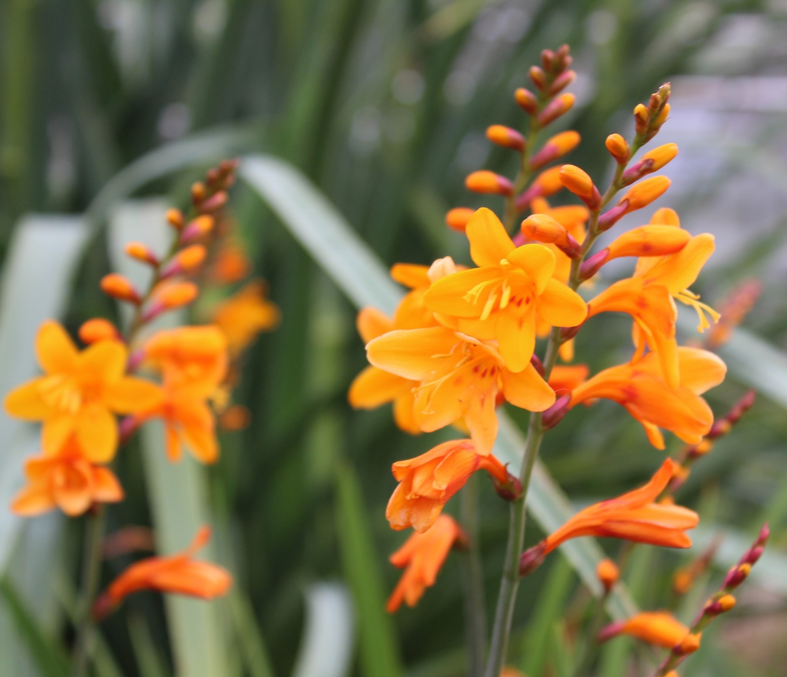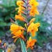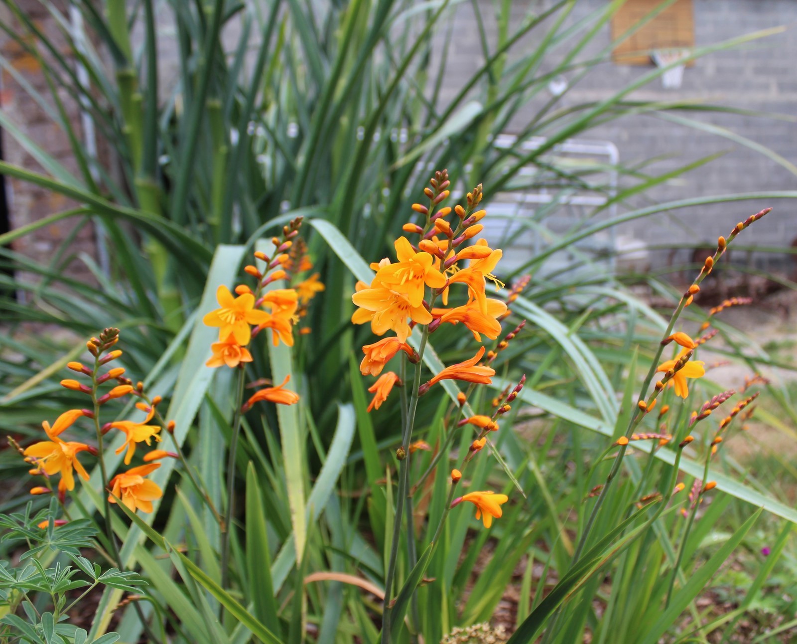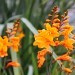 Crocosmia 'Columbus' est une plante vivace bulbeuse formant rapidement des touffes denses de longues feuilles à partir de son stock de bulbes, laissant peu de place aux adventices, en faisant un excellent couvre sol, même à l'ombre légère. Cette variété distinctive, avec ses fleurs d'or sur des calices violets est probablement une des variétés à la plus longue floraison du genre.