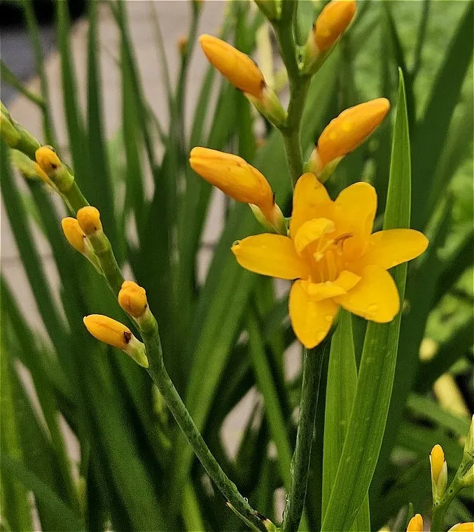 Crocosmia 'Gold Dust' est une plante vivace bulbeuse formant rapidement des touffes denses de longues feuilles à partir de son stock de bulbes, laissant peu de place aux adventices, en faisant un excellent couvre sol, même à l'ombre légère.