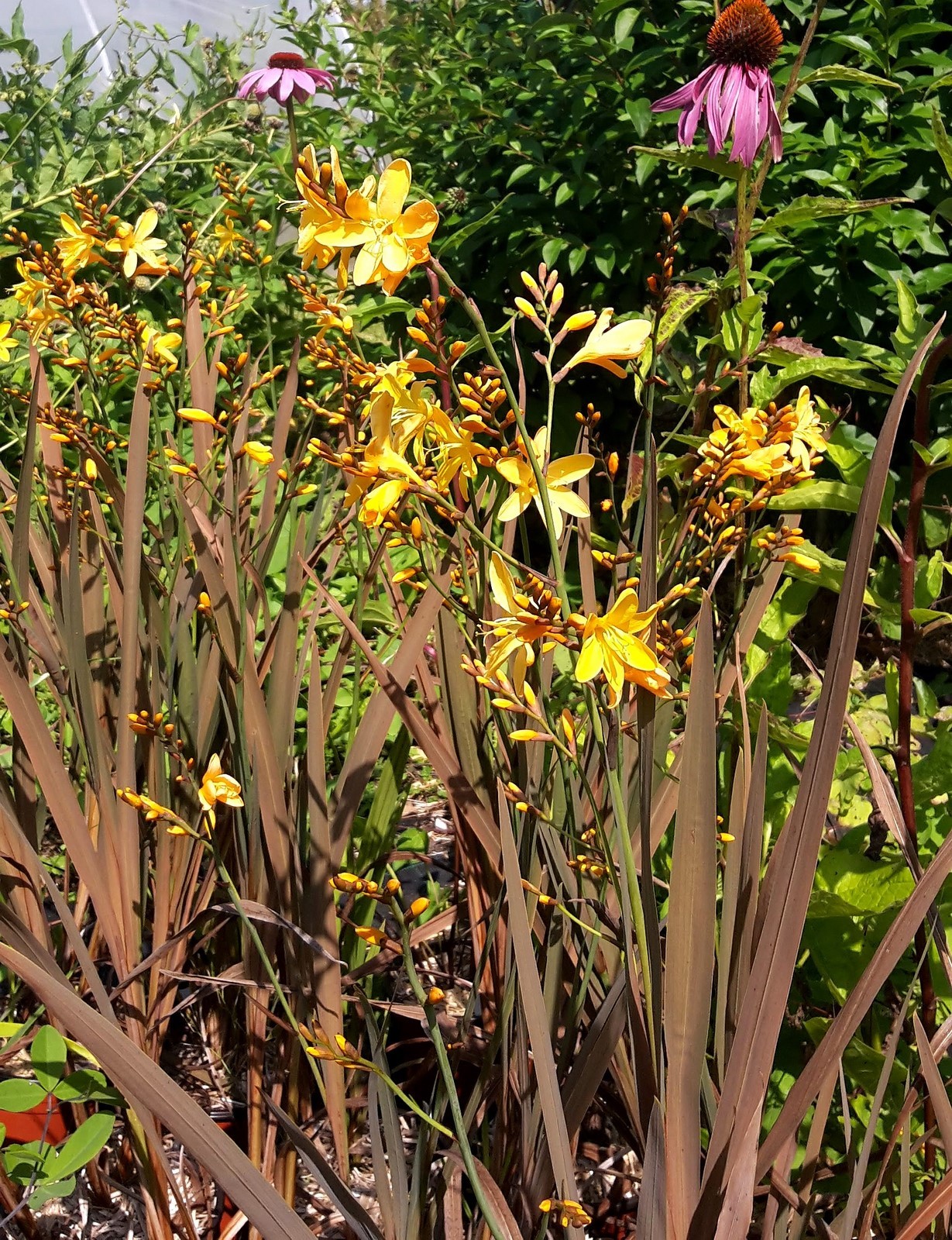 Crocosmia 'Solfatare' est une plante vivace bulbeuse formant rapidement des touffes denses de longues et fines feuilles à partir de son stock de bulbes, laissant peu de place aux adventices, en faisant un excellent couvre sol, même à l'ombre légère.