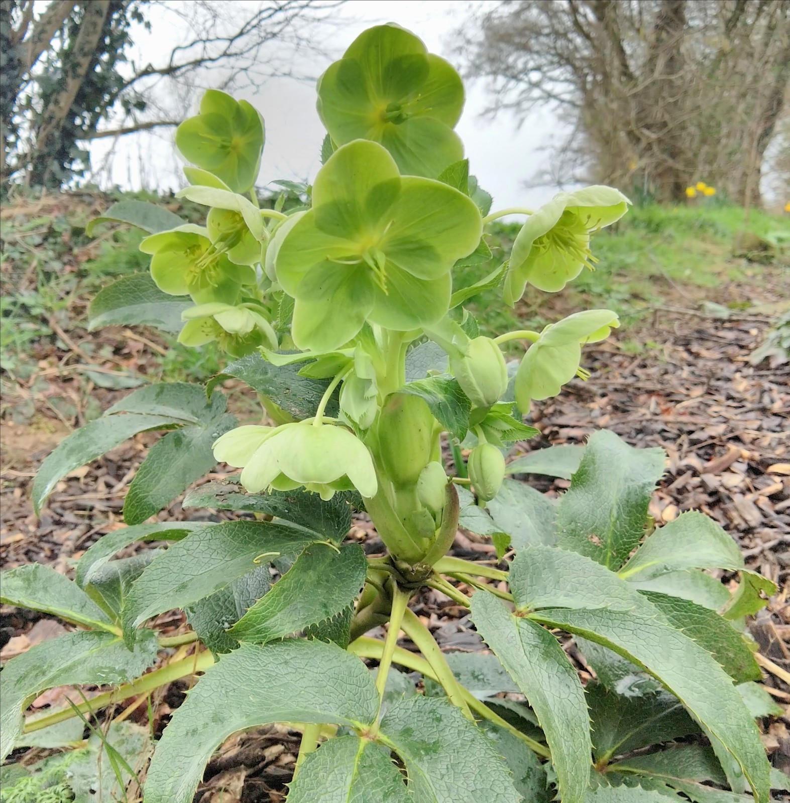 Helleborus argutifolius est une plante vivace semi ligneuse formant une touffe de feuilles divisées en 3 folioles, dentelées et cuireuses vertes clair. Dès le mois de janvier, jusqu'à 30 grandes fleurs vertes s'épanouissent sur le haut de la plante pour rester décoratives jusqu'au milieu du printemps. une floraison longue et assez exceptionnelle. facile de culture au soleil dans un sol pas trop lourd. A remplacer tous les 4 à 5 ans.
