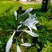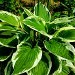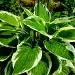 Hosta 'Patriot est une plante vivace herbacée formant des touffes de grandes feuilles cordiformes vertes clair bordées de blanc. En été, les fleurs bleu lavande forment des bouquets largement au dessus du feuillage.
