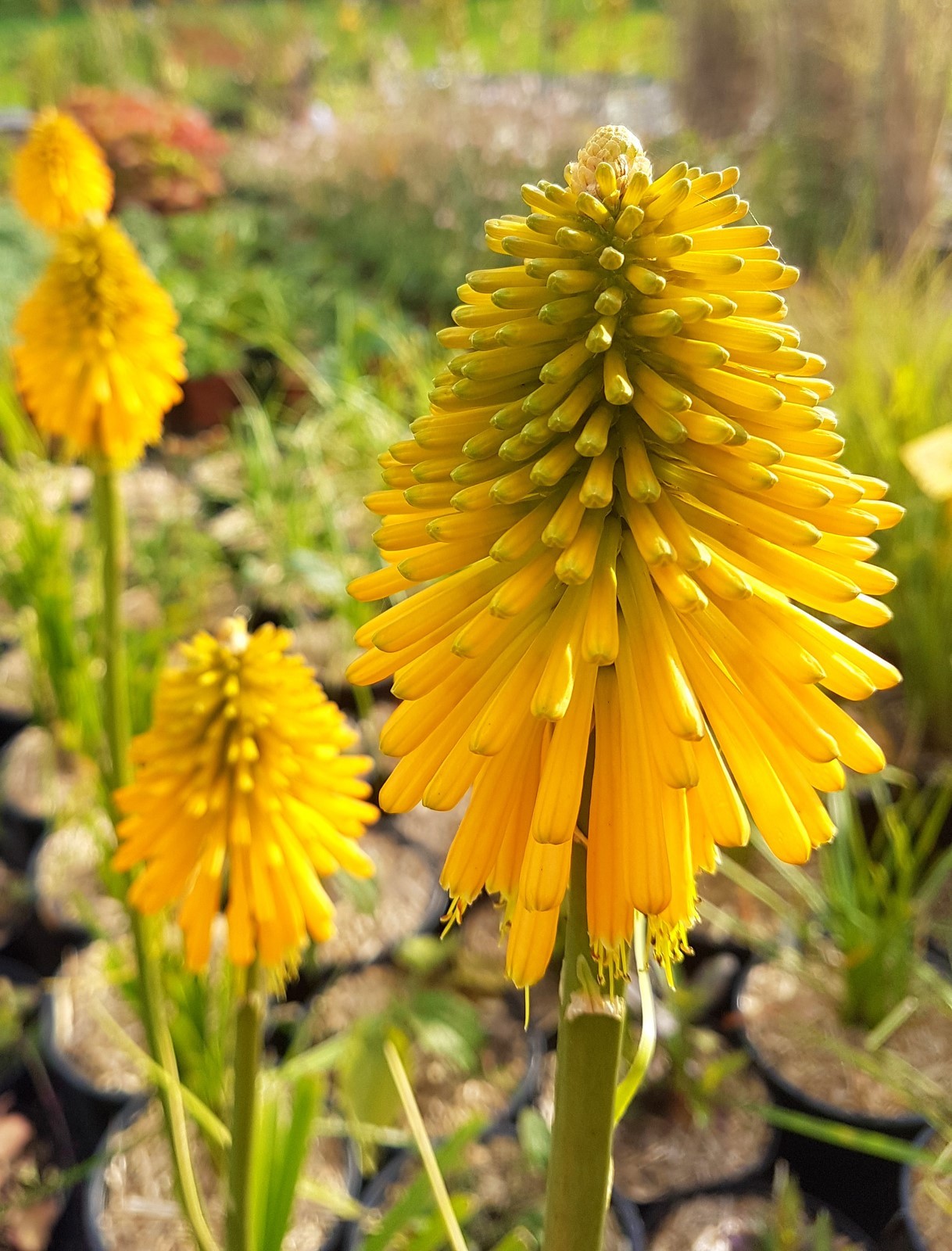 Kniphofia 'Happy Halloween' est une plante vivace persistante formant une touffe dense de rosettes de feuilles longues et fines, très décoratives et aux allures exotiques. Une variété tardive puisque c'est seulement en automne que les inflorescences se déploient sur des tiges dressées et passent d'un vert-jaune au orange-verdâtre étrange et original; floraison tardive mais toutefois particulièrement longue, souvent jusque fin novembre !