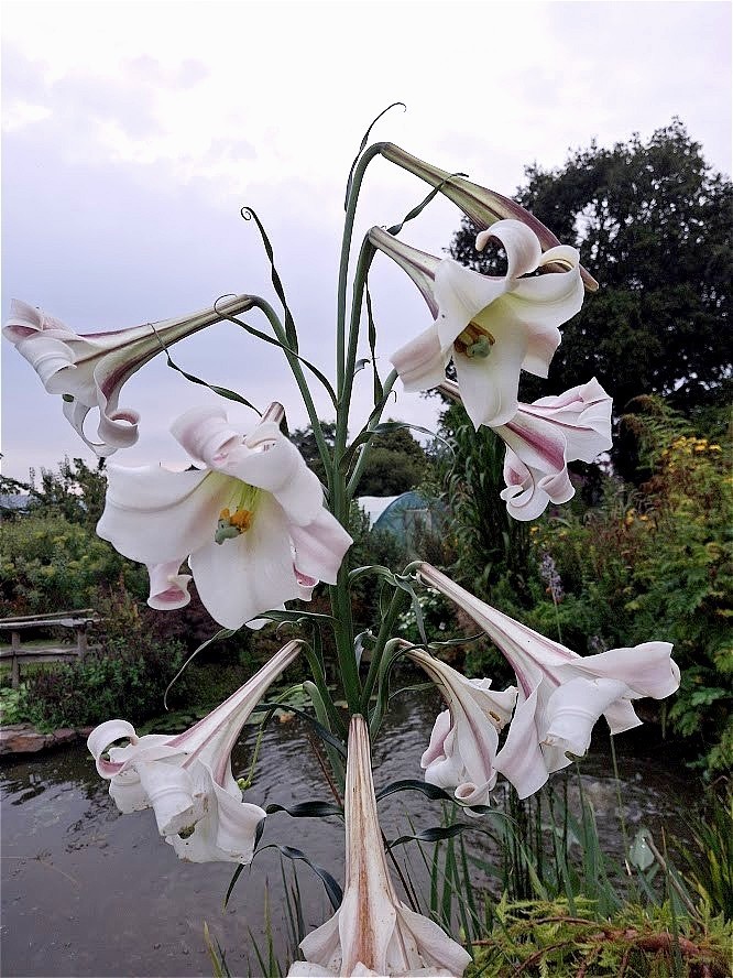 Lilium regale, le Lis royal, est un bulbe vivace formant de petites colonies souterraines denses desquelles au milieu du printemps émergent les grandes tiges qui porteront les grandes trompettes blanches rosées en milieu d'été. Les fleurs sont très parfumées et tiennent bien en vase.