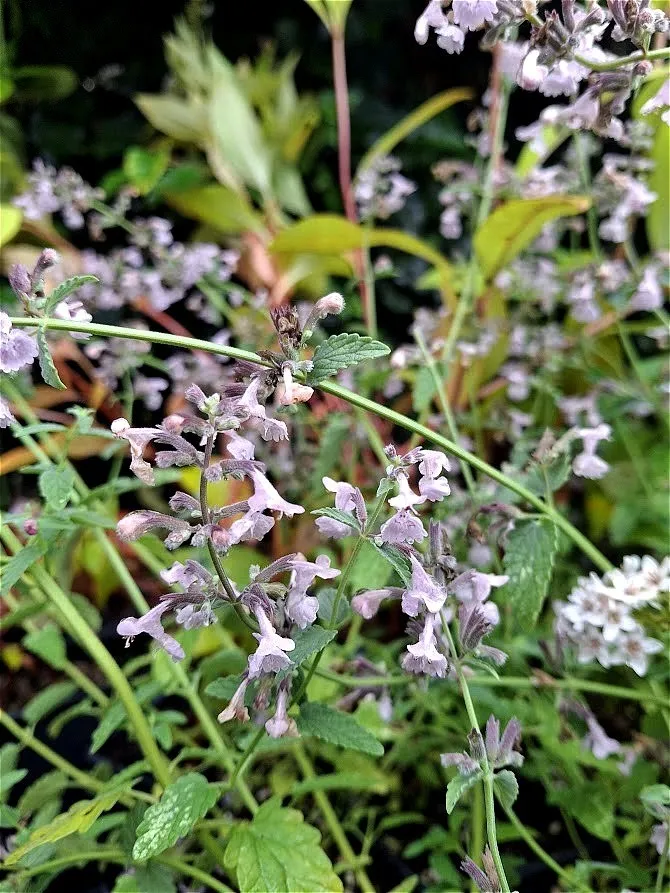 Nepeta racemosa 'Amelia' est une vivace caduque formant des coussins larges et bas, de feuilles vert gris, parfumées au toucher, recouverts de petites fleurs rose pale de la fin du printemps jusqu'aux gelées.