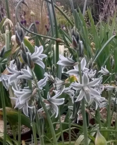 Ornithogalum nutans est une plante vivace bulbeuse à floraison printanière développant une touffe de feuilles vertes bleutées en fin d'hiver, puis, au printemps s'effacent pour laisser apparaître les tiges florales érigées couvertes de fleurs argentées au revers verdâtres, offrant un spectacle rare chez les plantes à fleurs.
