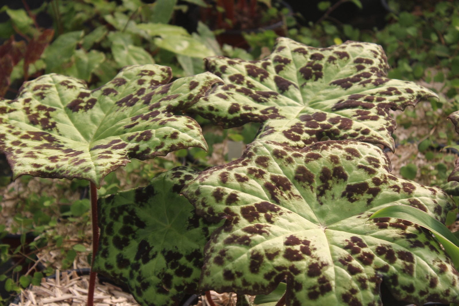 Podophyllum 'Spotty Dotty' est une plante vivace rhizomateuse développant de larges feuilles de 40 cm de diamètre en étoile vertes claires tachetées de brun, dès le début du printemps, les feuilles sortant directement de terre. Les fleurs rouges, retombantes sont sous le feuillage et peu visibles. Le feuillage a lui seul fait un énorme effet au sous bois. Chez nous, nous l'appelons la plante préhistorique tant elle est originale !