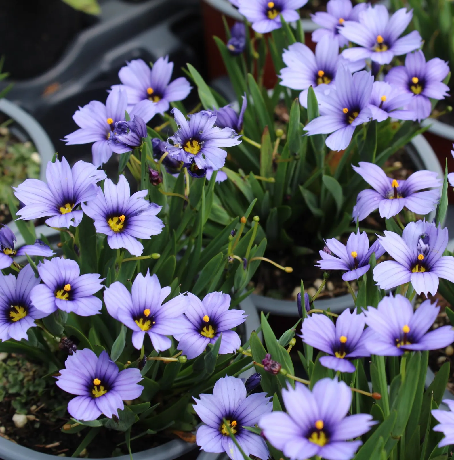 Sisyrinchium 'Devon skies' est une petite plante vivace à feuillage persistant ressemblant à une graminée. La longue et abondante floraison estivale d'une multitude de fleurs bleu violacées est un show a elle seule au jardin de gravier, en rocaille ou même en potée fleurie sur la terrasse.
