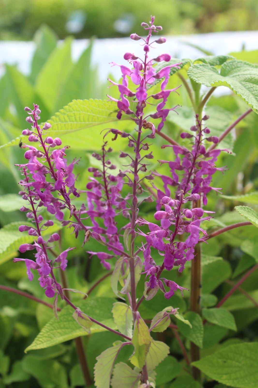 Teucrium betonicum est un arbrisseau persistant originaire de Madère qui forme un buisson de larges feuilles vert gris très aromatique. Au printemps, la plante se couvre de longs épis de fleurs roses. A planter en sol drainant en plein soleil, éventuellement contre un mur au sud dans les régions aux hivers plus froids, possible aussi en bord de mer. Très résistant à la chaleur et au sec.