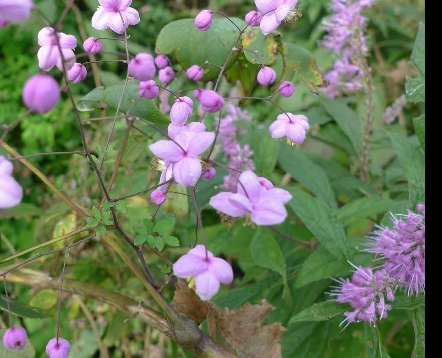 Thalictrum rochebrunianum var. grandisepalum est une plante vivace formant une petite touffe de feuillage semblable à celui des ancolies mais particulièrement bleuté. Les tiges florales sont dressées et accueillent à leurs extrémités un nuage de petites fleurs rose / violet clair aux étamines jaunes.