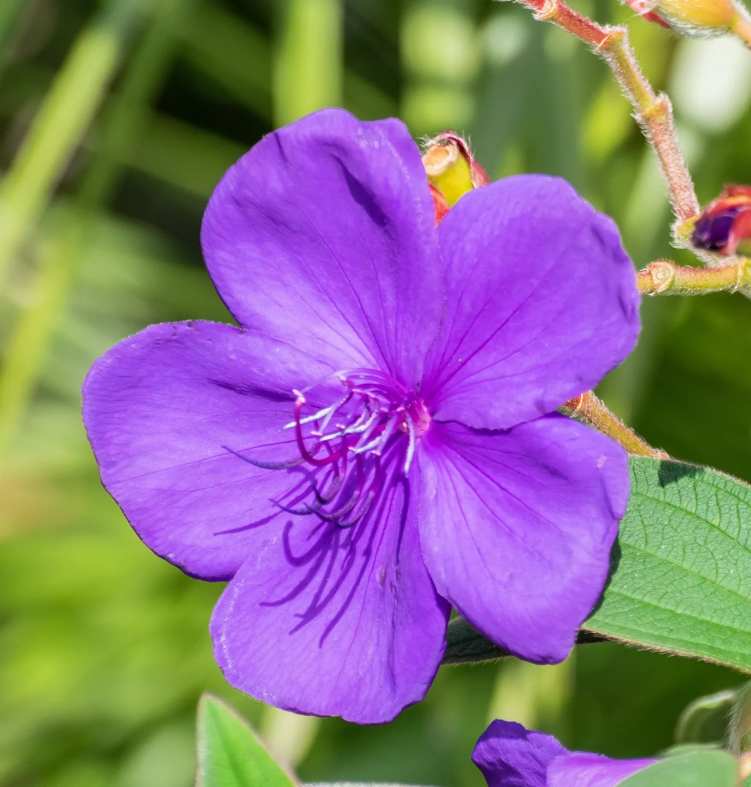 Tibouchina urvilleana est un arbuste exotique aux feuilles vertes brillantes nervurées et duveteuses, très ornementales. Les grandes fleurs bleues violacées apparaissent en automne, alors que toutes les extrémités florales et boutons de la plante se sont teintée de rouge. Un superbe arbuste qui supportera un peu le gel dans un sol bien drainé et riche, mais qui vivra également très bien en véranda, avec un bon arrosage en été et un apport d'engrais annuel.